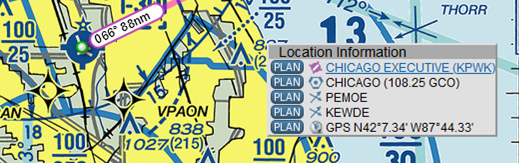 Another way to add in waypoints is to click a point on the magenta line and drag it to where you want the new waypoint to be. When you release the mouse button the same selection window appears, but this time pressing PLAN will insert the waypoint between the previous and next waypoints. This is actually very useful for adding waypoints at key transition points like at the boundaries between the shelves of class B and C airspaces. You can also drag waypoints to a different location using this method. Drag the waypoint to the new location and press PLAN.