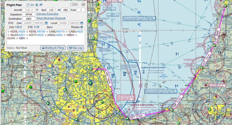 Finally, if you want to see the final version of my flight plan, just enter this into the white field in SkyVector: KPWK 420646N0874531W KENIL/A025 415329N0873546W 414156N0873014W/A031 KGYY/A035 STYLE/A055 KBEH KLWA KBIV